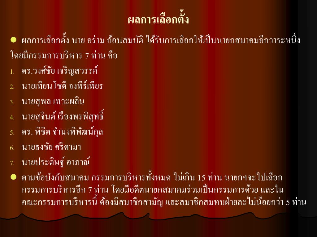 ผลการเลือกตั้ง ผลการเลือกตั้ง นาย อร่าม ก้อนสมบัติ ได้รับการเลือกให้เป็นนายกสมาคมอีกวาระหนึ่ง โดยมีกรรมการบริหาร 7 ท่าน คือ ดร.วงศ์ชัย เจริญสวรรค์ นายเทียนโชติ จงพีร์เพียร นายสุพล เทวะผลิน นายสุจินต์ เรืองพรพิสุทธิ์ ดร. พิชิต จำนงพิพัฒน์กุล นายธงชัย ศรีดามา นายประดิษฐ์ อาภาณ์ ตามข้อบังคับสมาคม กรรมการบริหารทั้งหมด ไม่เกิน 15 ท่าน นายกฯจะไปเลือกกรรมการบริหารอีก 7 ท่าน โดยมีอดีตนายกสมาคมร่วมเป็นกรรมการด้วย และในคณะกรรมการบริหารนี้ ต้องมีสมาชิกสามัญ และสมาชิกสมทบฝ่ายละไม่น้อยกว่า 5 ท่าน