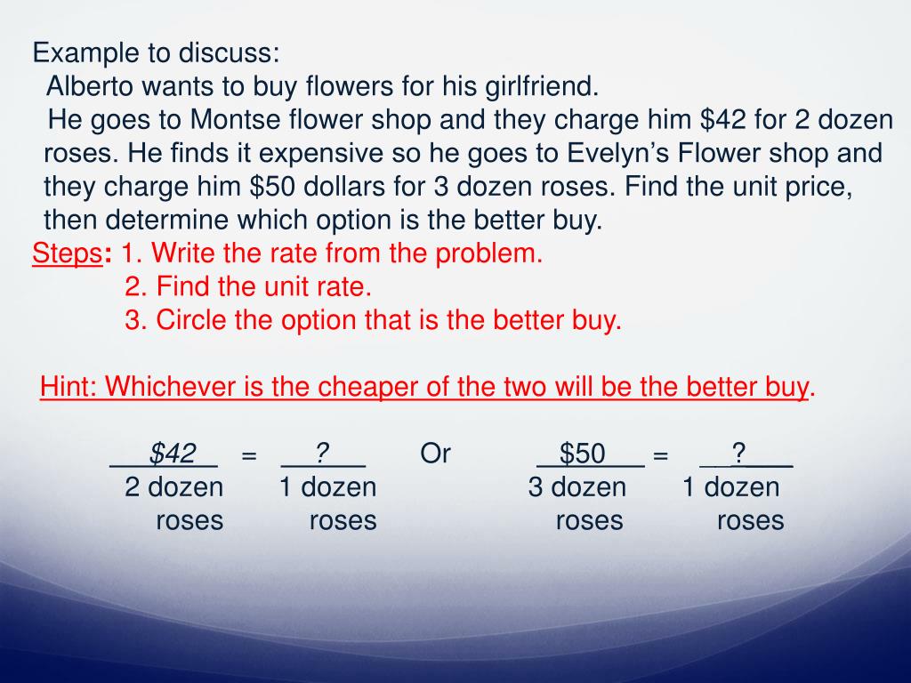 Example to discuss: Alberto wants to buy flowers for his girlfriend. He goes to Montseflower shop and they charge him $42 for 2 dozen roses. He finds it expensive so he goes to Evelyn’s Flower shop and they charge him $50 dollars for 3 dozen roses. Find the unit price, then determine which option is the better buy. Steps: 1. Write the rate from the problem. 2. Find the unit rate. 3. Circle the option that is the better buy. Hint: Whichever is the cheaper of the two will be the better buy. $42 = ? Or $50 = __?___ 2 dozen 1 dozen 3 dozen 1 dozen roses rosesrosesroses
