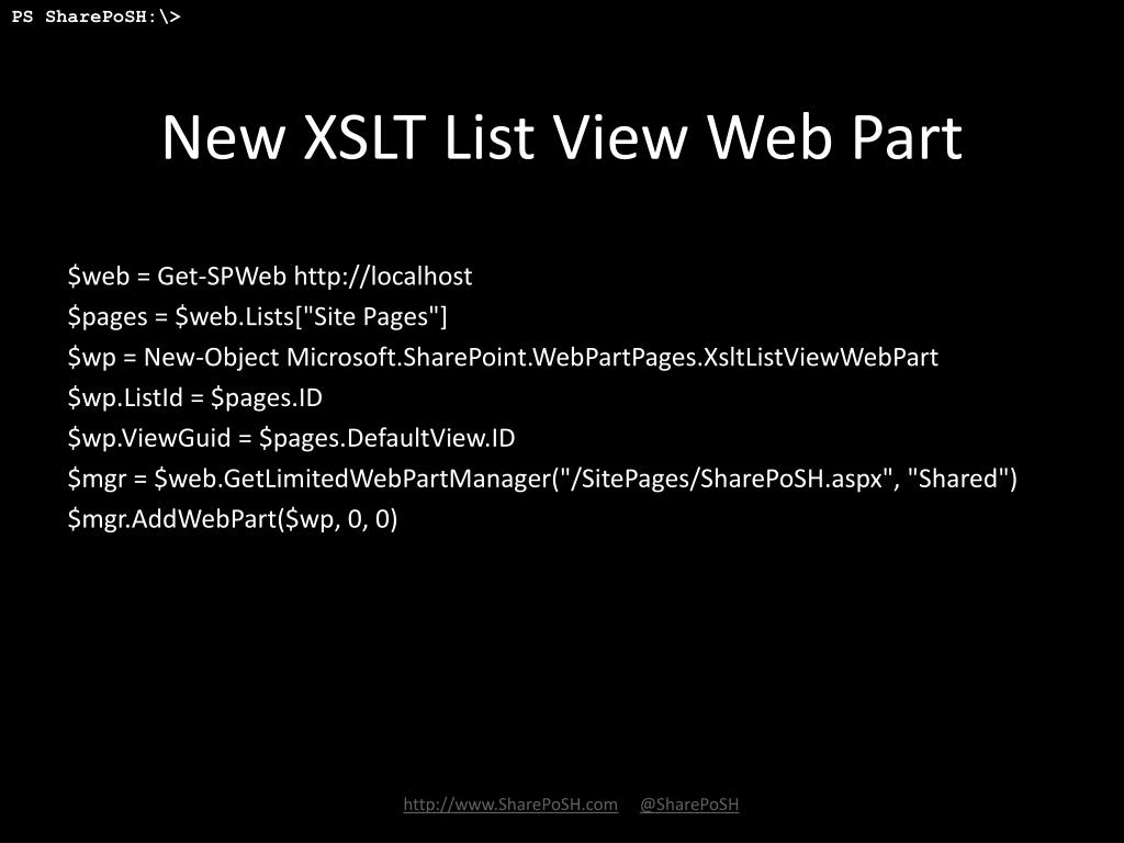 New XSLT List View Web Part $web = Get-SPWeb http://localhost $pages = $web.Lists["Site Pages"] $wp = New-Object Microsoft.SharePoint.WebPartPages.XsltListViewWebPart $wp.ListId = $pages.ID $wp.ViewGuid = $pages.DefaultView.ID $mgr = $web.GetLimitedWebPartManager("/SitePages/SharePoSH.aspx", "Shared") $mgr.AddWebPart($wp, 0, 0)
