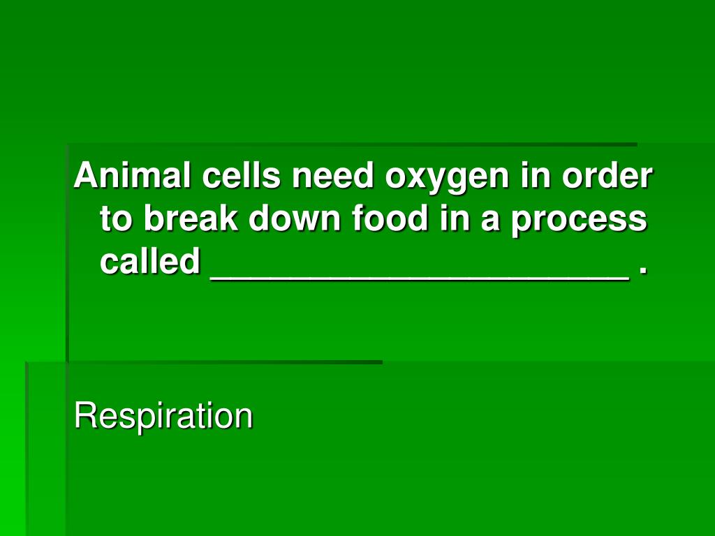 Animal cells need oxygen in order to break down food in a process called _____________________ . Respiration