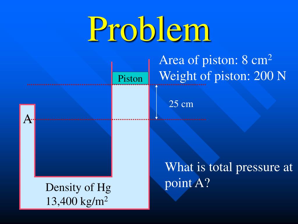 Piston 25 cm Density of Hg 13,400 kg/m2 Problem Area of piston: 8 cm2 Weight of piston: 200 N A What is total pressure at point A?