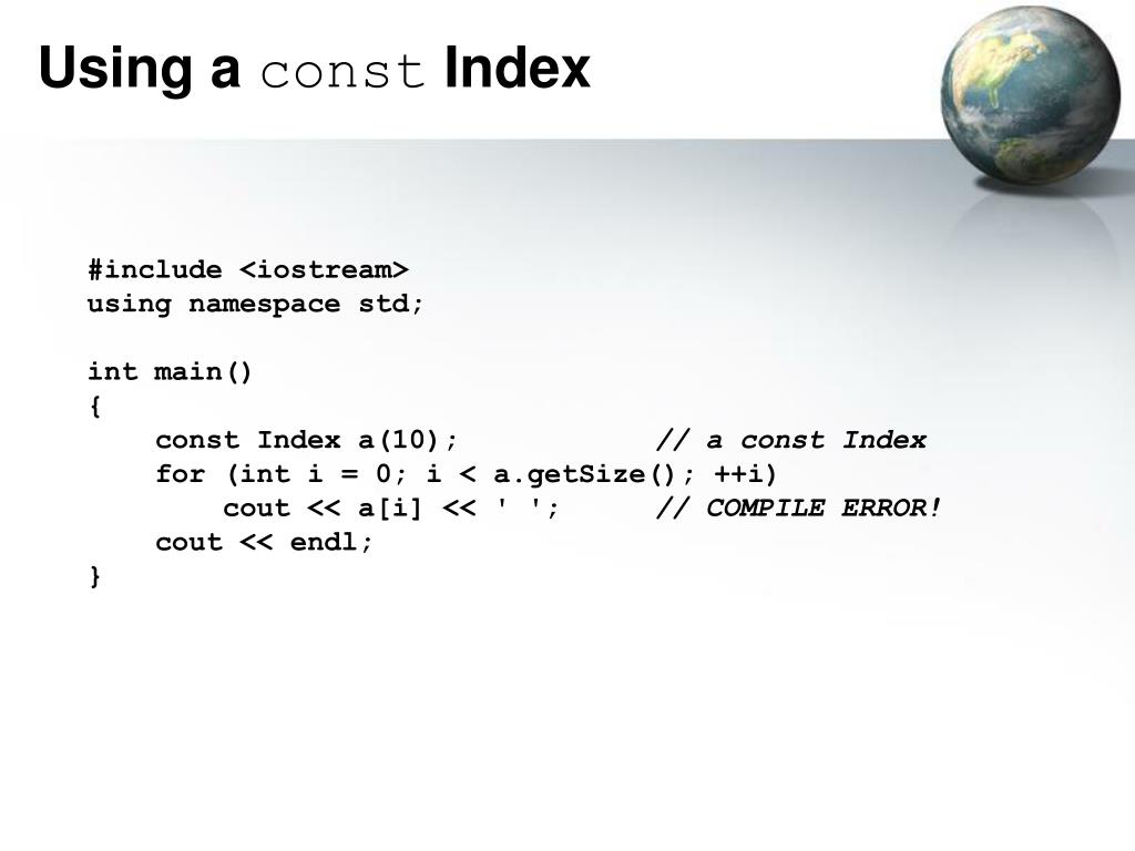 Using a const Index #include <iostream> using namespace std; int main() { const Index a(10); // a const Index for (int i = 0; i < a.getSize(); ++i) cout << a[i] << ' '; // COMPILE ERROR! cout << endl; }
