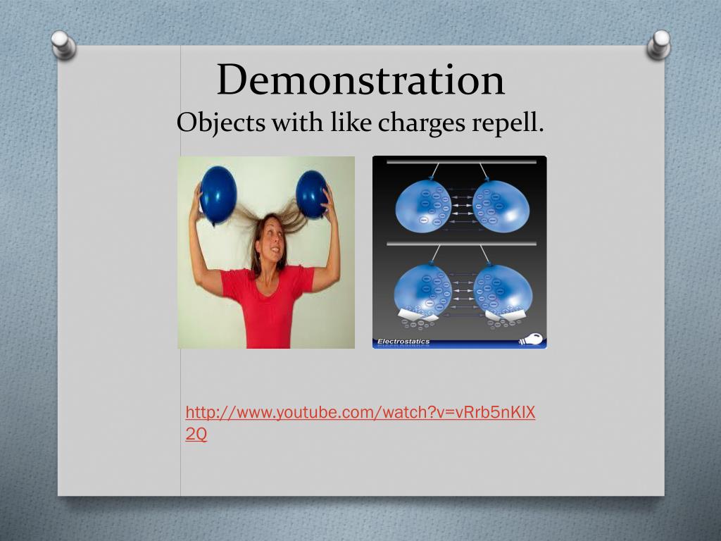 DemonstrationObjects with like charges repell. http://www.youtube.com/watch?v=vRrb5nKIX2Q