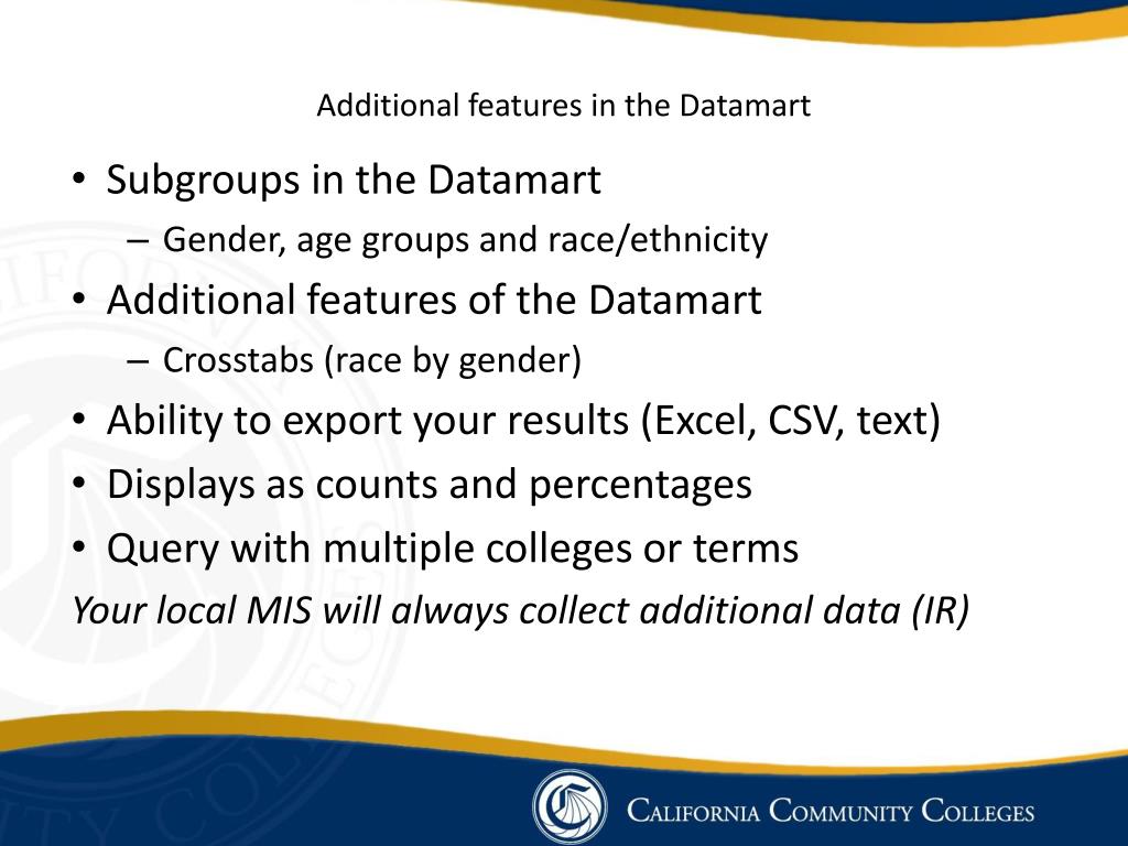 Additional features in the Datamart • Subgroups in the Datamart • Gender, age groups and race/ethnicity • Additional features of the Datamart • Crosstabs (race by gender) • Ability to export your results (Excel, CSV, text) • Displays as counts and percentages • Query with multiple colleges or terms Your local MIS will always collect additional data (IR)