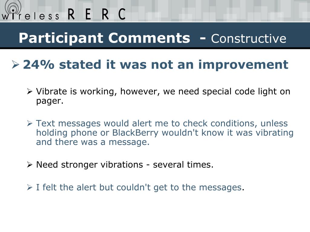 Participant Comments - Constructive • 24% stated it was not an improvement • Vibrate is working, however, we need special code light on pager. • Text messages would alert me to check conditions, unless holding phone or BlackBerry wouldn't know it was vibrating and there was a message. • Need stronger vibrations - several times. • I felt the alert but couldn't get to the messages.