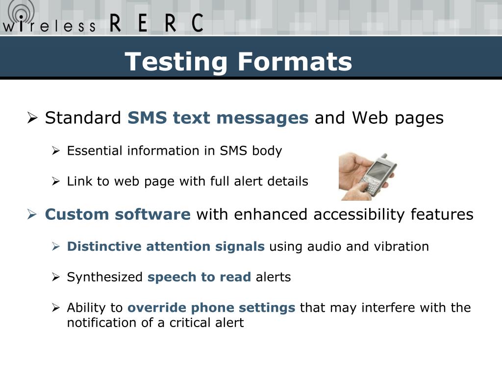 Testing Formats • Standard SMS text messages and Web pages • Essential information in SMS body • Link to web page with full alert details • Custom software with enhanced accessibility features • Distinctive attention signals using audio and vibration • Synthesized speech to read alerts • Ability to override phone settings that may interfere with the notification of a critical alert
