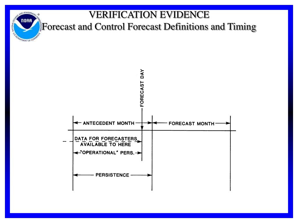 VERIFICATION EVIDENCE • Verification of monthly mean U.S. surface temperature forecasts • Issued twice-monthly for three categories at “zero” lead (3-5 days) from 1973 through 1994 • Verified with a modified Heidke skill score for 102 mega-divisions • Verification repeated for “operational persistence” • Differences computed to normalize for “predictability” • Smoothed with a 25-forecast running mean