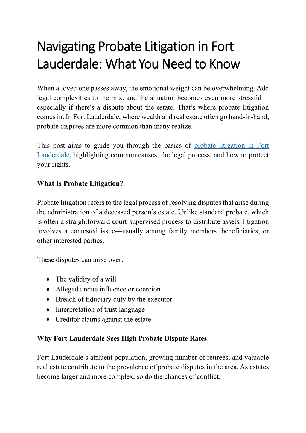 Navigating Probate Litigation in Fort Navigating Probate Litigation in Fort Lauderdale: What You Need to Know Lauderdale: What You Need to Know When a loved one passes away, the emotional weight can be overwhelming. Add legal complexities to the mix, and the situation becomes even more stressful— especially if there's a dispute about the estate. That’s where probate litigation comes in. In Fort Lauderdale, where wealth and real estate often go hand-in-hand, probate disputes are more common than many realize. This post aims to guide you through the basics of probate litigation in Fort Lauderdale, highlighting common causes, the legal process, and how to protect your rights. What Is Probate Litigation? Probate litigation refers to the legal process of resolving disputes that arise during the administration of a deceased person’s estate. Unlike standard probate, which is often a straightforward court-supervised process to distribute assets, litigation involves a contested issue—usually among family members, beneficiaries, or other interested parties. These disputes can arise over: •The validity of a will •Alleged undue influence or coercion •Breach of fiduciary duty by the executor •Interpretation of trust language •Creditor claims against the estate Why Fort Lauderdale Sees High Probate Dispute Rates Fort Lauderdale’s affluent population, growing number of retirees, and valuable real estate contribute to the prevalence of probate disputes in the area. As estates become larger and more complex, so do the chances of conflict.