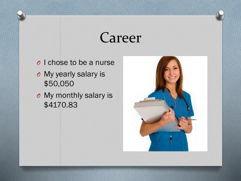 Career • I chose to be a nurse • My yearly salary is $50,050 • My monthly salary is $4170.83
