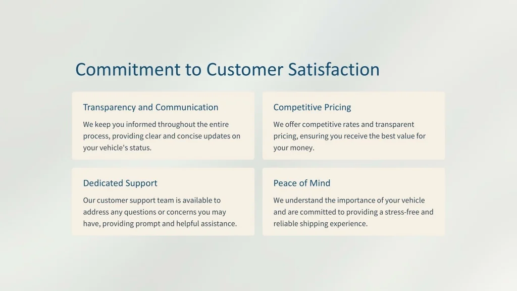 Commitment to Customer Satisfaction Transparency and Communication Competitive Pricing We keep you informed throughout the entire process, providing clear and concise updates on your vehicle's status. We offer competitive rates and transparent pricing, ensuring you receive the best value for your money. Dedicated Support Peace of Mind Our customer support team is available to address any questions or concerns you may have, providing prompt and helpful assistance. We understand the importance of your vehicle and are committed to providing a stress-free and reliable shipping experience.