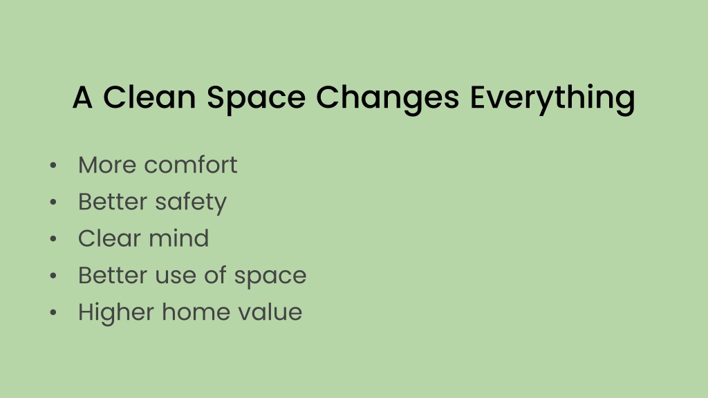 A Clean Space Changes Everything • More comfort • Better safety • Clear mind • Better use of space • Higher home value