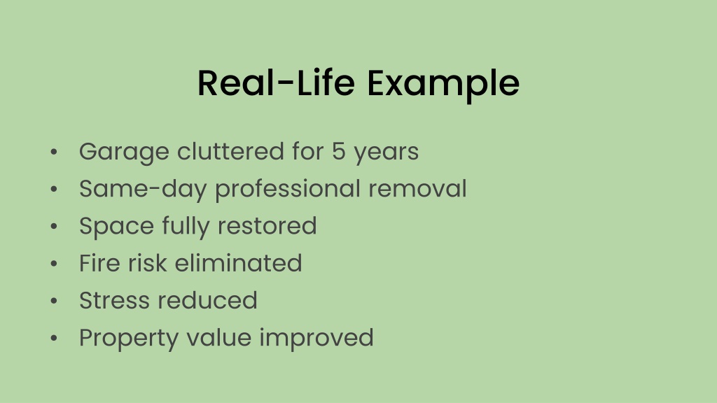 Real-Life Example • Garage cluttered for 5 years • Same-day professional removal • Space fully restored • Fire risk eliminated • Stress reduced • Property value improved