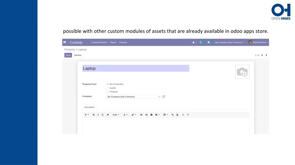 OpenHRMS Custody In this module, by the latest update, we have the provision to link the property with the products or to assets. To get the assets you need to have the enterprise or else we can modify a simple code capable make it