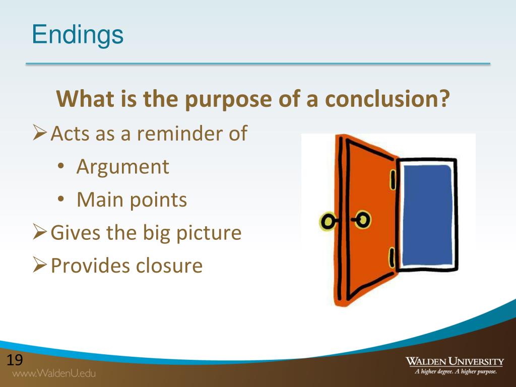 Endings What is the purpose of a conclusion? • Acts as a reminder of • Argument • Main points • Gives the big picture • Provides closure