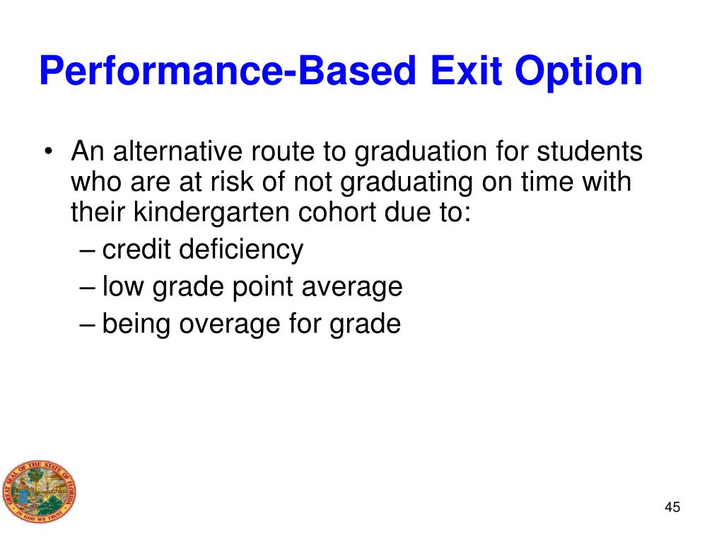 Performance-Based Exit Option • An alternative route to graduation for students who are at risk of not graduating on time with their kindergarten cohort due to: • credit deficiency • low grade point average • being overage for grade