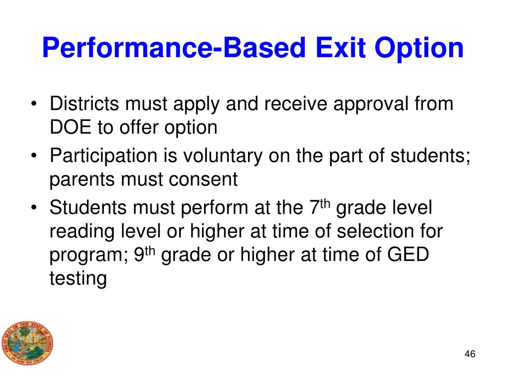 Performance-Based Exit Option • Districts must apply and receive approval from DOE to offer option • Participation is voluntary on the part of students; parents must consent • Students must perform at the 7th grade level reading level or higher at time of selection for program; 9th grade or higher at time of GED testing