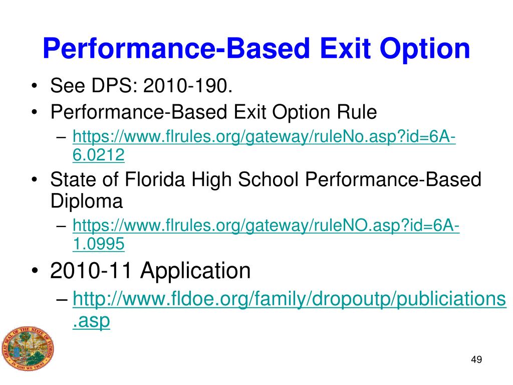 Performance-Based Exit Option • See DPS: 2010-190. • Performance-Based Exit Option Rule • https://www.flrules.org/gateway/ruleNo.asp?id=6A-6.0212 • State of Florida High School Performance-Based Diploma • https://www.flrules.org/gateway/ruleNO.asp?id=6A-1.0995 • 2010-11 Application • http://www.fldoe.org/family/dropoutp/publiciations.asp