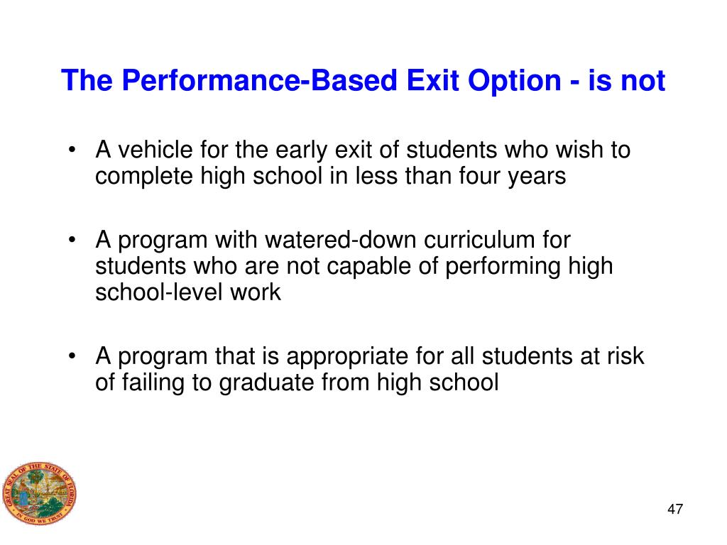 The Performance-Based Exit Option - is not • A vehicle for the early exit of students who wish to complete high school in less than four years • A program with watered-down curriculum for students who are not capable of performing high school-level work • A program that is appropriate for all students at risk of failing to graduate from high school