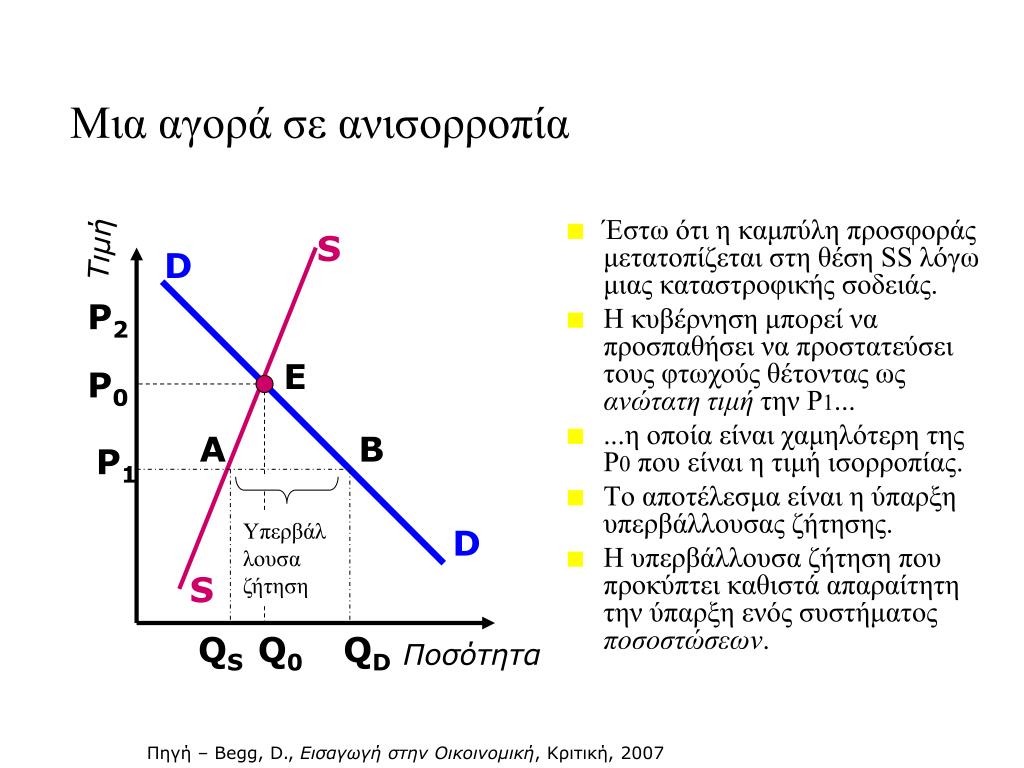 Έστω ότι η καμπύλη προσφοράς μετατοπίζεται στη θέση SS λόγω μιας καταστροφικής σοδειάς. Η κυβέρνηση μπορεί να προσπαθήσει να προστατεύσει τους φτωχούς θέτοντας ως ανώτατη τιμή την P1... ...η οποία είναι χαμηλότερη της P0 που είναι η τιμή ισορροπίας. Το αποτέλεσμα είναι η ύπαρξη υπερβάλλουσας ζήτησης. Η υπερβάλλουσα ζήτηση που προκύπτει καθιστά απαραίτητη την ύπαρξη ενός συστήματος ποσοστώσεων. Υπερβάλλουσα ζήτηση Μια αγορά σε ανισορροπία S Τιμή D P2 E P0 A B P1 D S QS Q0 QD Ποσότητα Πηγή – Begg, D., Εισαγωγή στην Οικοινομική, Κριτική, 2007