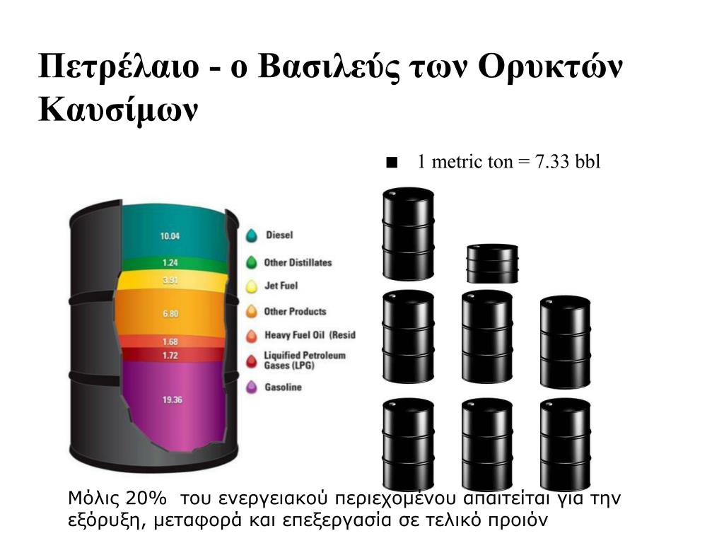 Πετρέλαιο - ο Βασιλεύς των Ορυκτών Καυσίμων • 1 metric ton = 7.33 bbl Μόλις 20% του ενεργειακού περιεχομένου απαιτείται για την εξόρυξη, μεταφορά και επεξεργασία σε τελικό προιόν