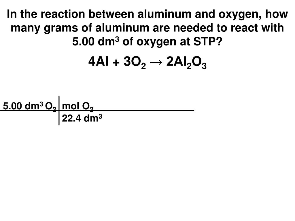 In the reaction between aluminum and oxygen, how many grams of aluminum are needed to react with 5.00 dm3 of oxygen at STP? 4Al + 3O2 → 2Al2O3 5.00 dm3 O2 mol O2 4 mol Al 22.4 dm3 3 mol O2