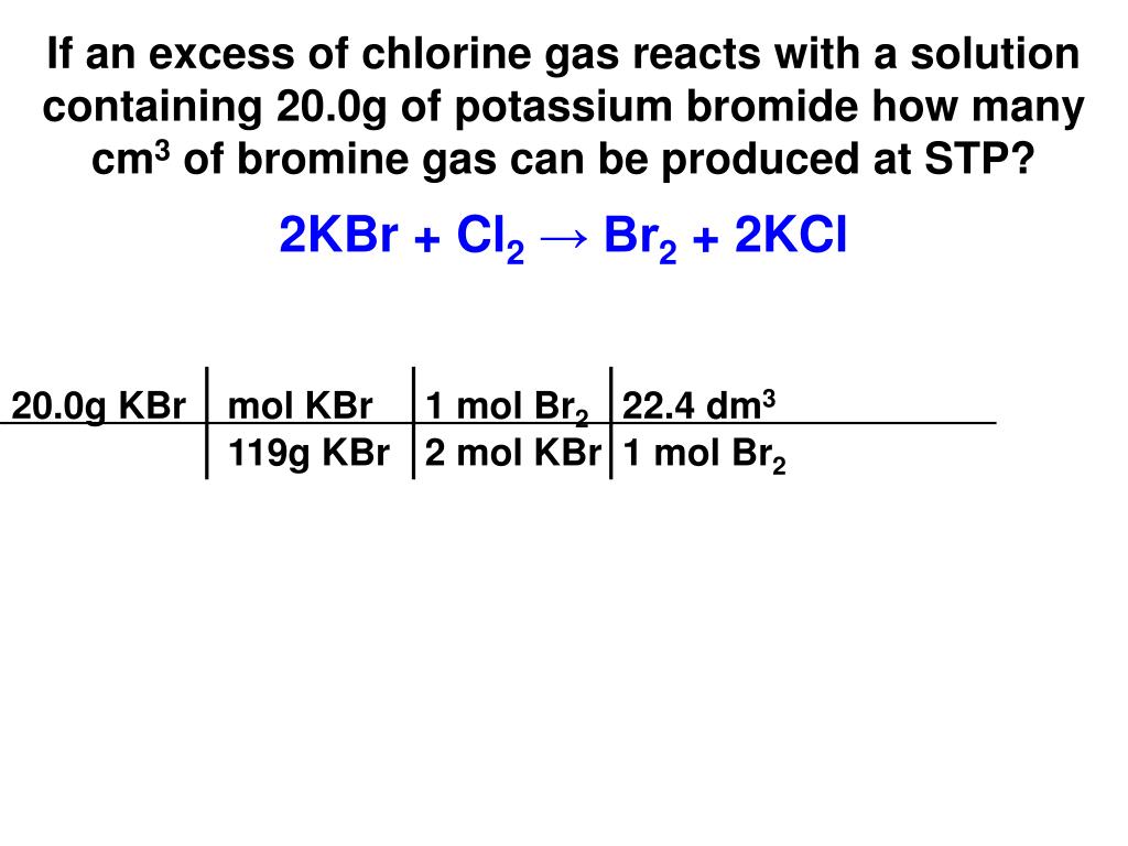 If an excess of chlorine gas reacts with a solution containing 20.0g of potassium bromide how many cm3 of bromine gas can be produced at STP? 2KBr + Cl2 → Br2 + 2KCl 20.0g KBr mol KBr 1 mol Br2 22.4 dm3 119g KBr 2 mol KBr 1 mol Br2