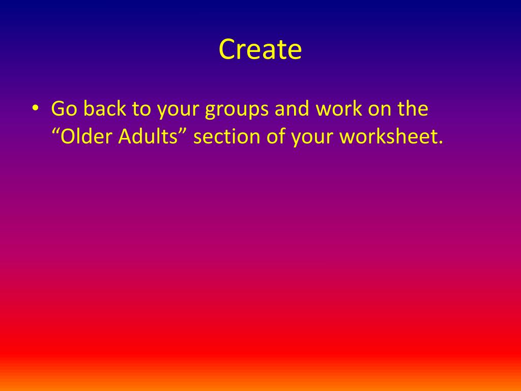 Create • Go back to your groups and work on the “Older Adults” section of your worksheet.