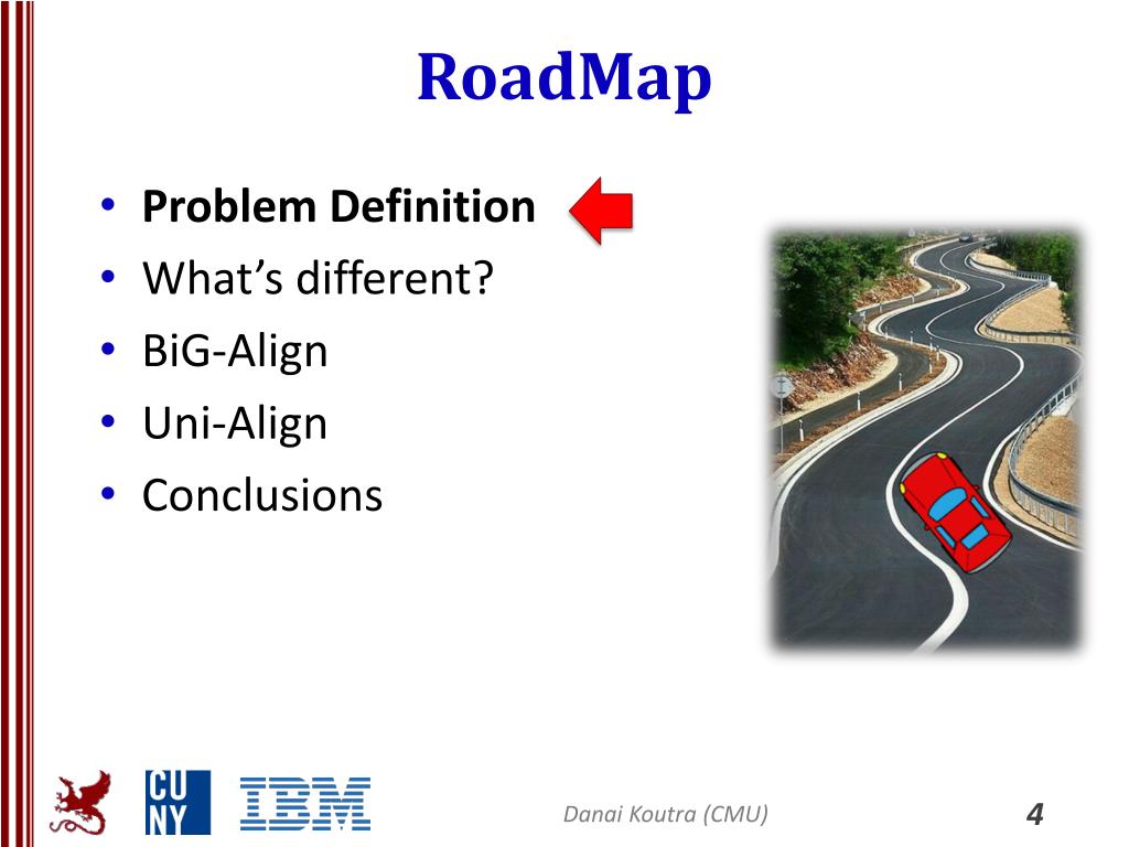 RoadMap • Problem Definition • What’s different? • BiG-Align • Uni-Align • Experiments • Conclusions Danai Koutra (CMU)