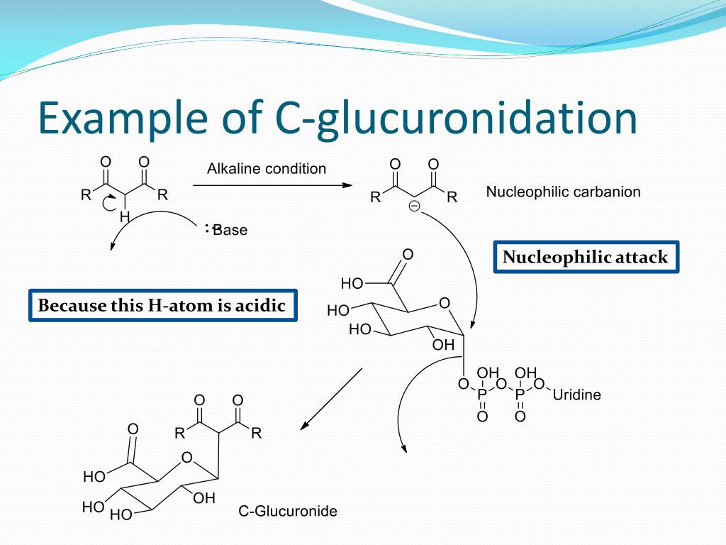 Example of C-glucuronidation Nucleophilic attack Because this H-atom is acidic