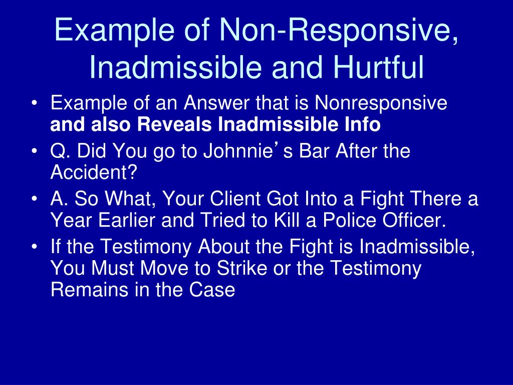 Non-Responsive, Inadmissible and Hurtful • When a W Cheats and Answers a Q Not Asked, the Answer (Part or All) is Nonresponsive • Only the Questioner Has This Objection • If the Questioner Does not Care that W Gave More than Was Asked, No Harm Done • If an Answer is Nonresponsive and also Reveals Inadmissible Info that Hurts, You Must Object and Move to Strike or the Inadmissible Info Stays in the Case