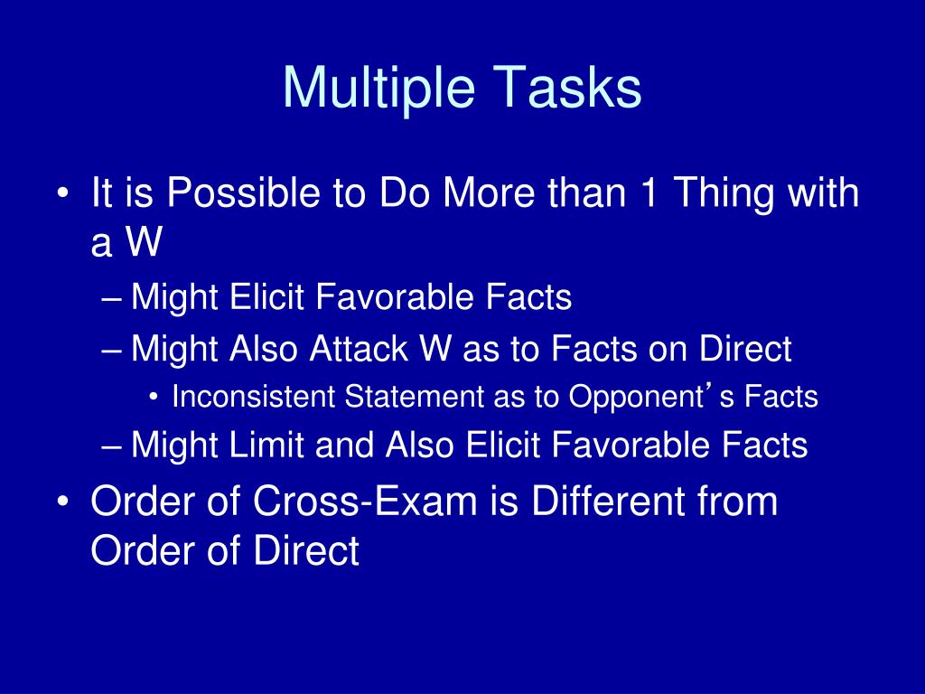 Multiple Tasks • It is Possible to Do More than 1 Thing with a W • Might Elicit Favorable Facts • Might Also Attack W as to Facts on Direct • Inconsistent Statement as to Opponent’s Facts • Might Limit and Also Elicit Favorable Facts • Order of Cross-Exam is Different from Order of Direct