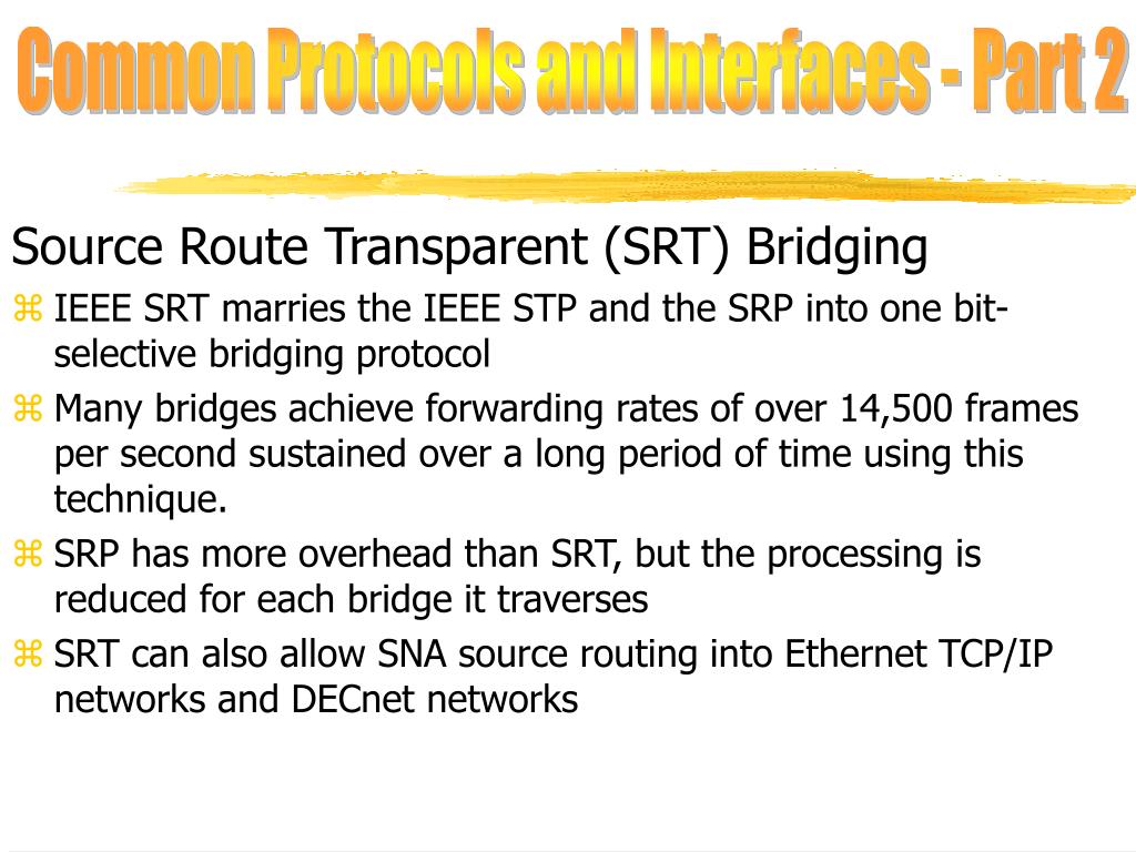 Common Protocols and Interfaces - Part 2 Source Route Transparent (SRT) Bridging • IEEE SRT marries the IEEE STP and the SRP into one bit-selective bridging protocol • Many bridges achieve forwarding rates of over 14,500 frames per second sustained over a long period of time using this technique. • SRP has more overhead than SRT, but the processing is reduced for each bridge it traverses • SRT can also allow SNA source routing into Ethernet TCP/IP networks and DECnet networks