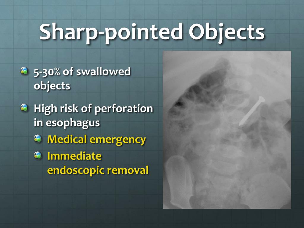 Sharp-pointed Objects • 5-30% of swallowed objects • High risk of perforation in esophagus • Medical emergency • Immediate endoscopic removal