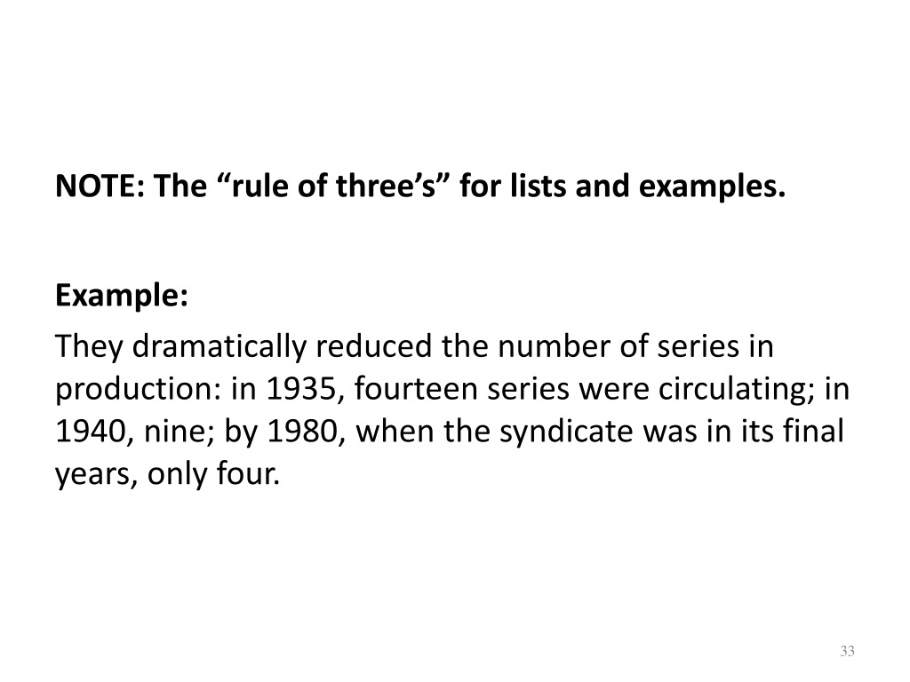 NOTE: The “rule of three’s” for lists and examples. Example: They dramatically reduced the number of series in production: in 1935, fourteen series were circulating; in 1940, nine; by 1980, when the syndicate was in its final years, only four.