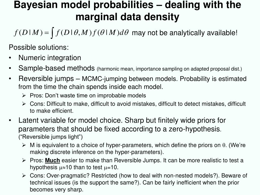 Bayesian model probabilities – dealing with the marginal data density may not be analytically available! Possible solutions: • Numeric integration • Sample-based methods (harmonic mean, importance sampling on adapted proposal dist.) • Reversible jumps – MCMC-jumping between models. Probability is estimated from the time the chain spends inside each model. • Pros: Don’t waste time on improbable models • Cons: Difficult to make, difficult to avoid mistakes, difficult to detect mistakes, difficult to make efficient. • Latent variable for model choice. Sharp but finitely wide priors for parameters that should be fixed according to a zero-hypothesis. (“Reversible jumps light”) • M is equivalent to a choice of hyper-parameters, which define the priors on . (We’re making discrete inference on the hyper-parameters). • Pros: Much easier to make than Reversible Jumps. It can be more realistic to test a hypothesis 10 than to test =10. • Cons: Over-pragmatic? Restricted (how to deal with non-nested models?). Beware of technical issues (is the support the same?). Can be fairly inefficient when the prior becomes very sharp.