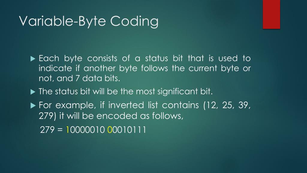 Variable-Byte Coding • Each byte consists of a status bit that is used to indicate if another byte follows the current byte or not, and 7 data bits. • The status bit will be the most significant bit. • For example, if inverted list contains (12, 25, 39, 279) it will be encoded as follows, 279 = 10000010 00010111