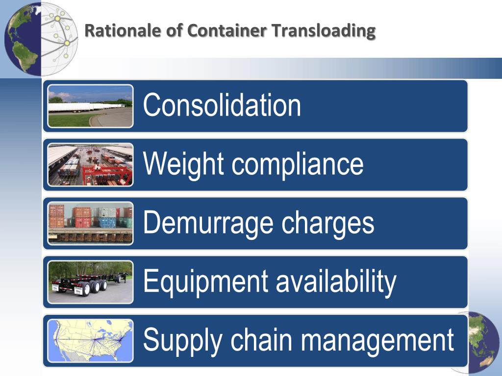 Asymmetries between Import and Export-Based Containerized Logistics Customer Distribution Center Inland Terminal Import-Based Gateway • Many Customers • Function of population density. • Geographical spread. • Incites transloading. • High priority (value, timeliness). Repositioning Supplier Export-Based • Few Suppliers • Function of resource density. • Geographical concentration. • Lower priority. • Depends on repositioning opportunities.