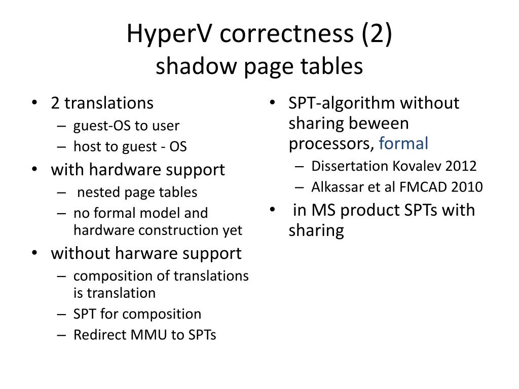 HyperVcorrectness (2)shadowpagetables • 2 translations • guest-OS touser • hosttoguest - OS • withhardwaresupport • nestedpagetables • no formal model andhardwareconstructionyet • withoutharwaresupport • compositionoftranslationsistranslation • SPT forcomposition • Redirect MMU to SPTs • SPT-algorithmwithoutsharingbeweenprocessors, formal • Dissertation Kovalev 2012 • Alkassar et al FMCAD 2010 • in MS product SPTs withsharing