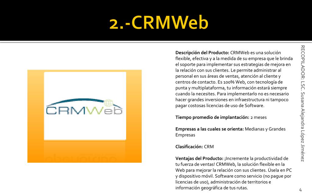2.-CRMWeb Descripción del Producto: CRMWeb es una solución flexible, efectiva y a la medida de su empresa que le brinda el soporte para implementar sus estrategias de mejora en la relación con sus clientes. Le permite administrar al personal en sus áreas de ventas, atención al cliente y centros de contacto. Es 100% Web, con tecnología de punta y multiplataforma, tu información estará siempre cuando la necesites. Para implementarlo no es necesario hacer grandes inversiones en infraestructura ni tampoco pagar costosas licencias de uso de Software. Tiempo promedio de implantación: 2 meses Empresas a las cuales se orienta: Medianas y Grandes Empresas Clasificación: CRM Ventajas del Producto: ¡Incremente la productividad de tu fuerza de ventas! CRMWeb, la solución flexible en la Web para mejorar la relación con sus clientes. Úsela en PC y dispositivo móvil. Software como servicio (no pague por licencias de uso), administración de territorios e información geográfica de tus rutas. RECOPILADOR: LSC. Susana Alejandra López Jiménez