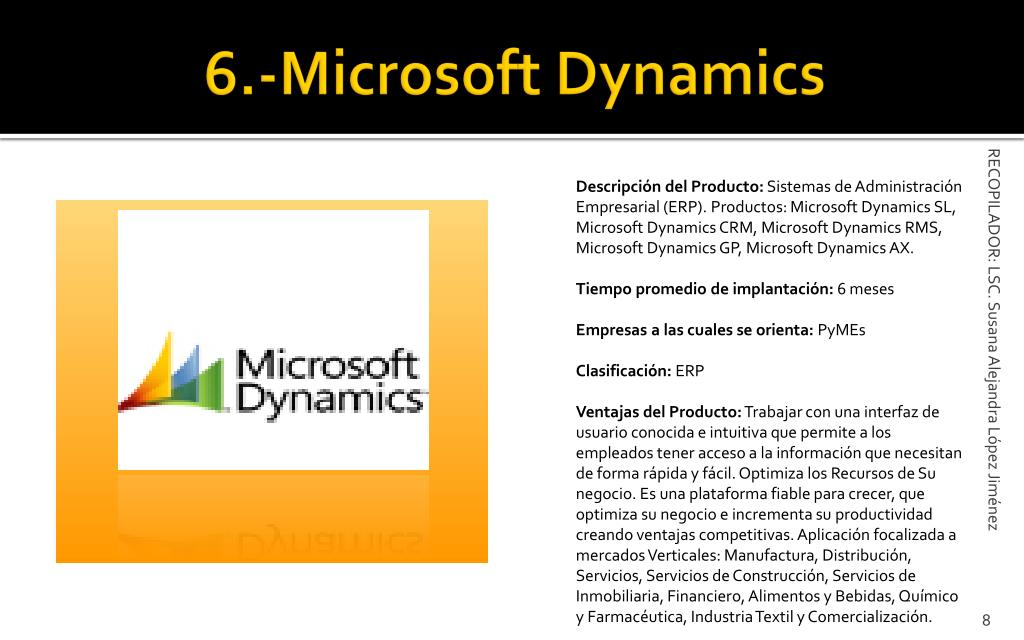 6.-Microsoft Dynamics Descripción del Producto:Sistemas de Administración Empresarial (ERP). Productos: Microsoft Dynamics SL, Microsoft Dynamics CRM, Microsoft Dynamics RMS, Microsoft Dynamics GP, Microsoft Dynamics AX. Tiempo promedio de implantación:6 meses Empresas a las cuales se orienta:PyMEs Clasificación:ERP Ventajas del Producto:Trabajar con una interfaz de usuario conocida e intuitiva que permite a los empleados tener acceso a la información que necesitan de forma rápida y fácil. Optimiza los Recursos de Su negocio. Es una plataforma fiable para crecer, que optimiza su negocio e incrementa su productividad creando ventajas competitivas. Aplicación focalizada a mercados Verticales: Manufactura, Distribución, Servicios, Servicios de Construcción, Servicios de Inmobiliaria, Financiero, Alimentos y Bebidas, Químico y Farmacéutica, Industria Textil y Comercialización. RECOPILADOR: LSC. Susana Alejandra López Jiménez