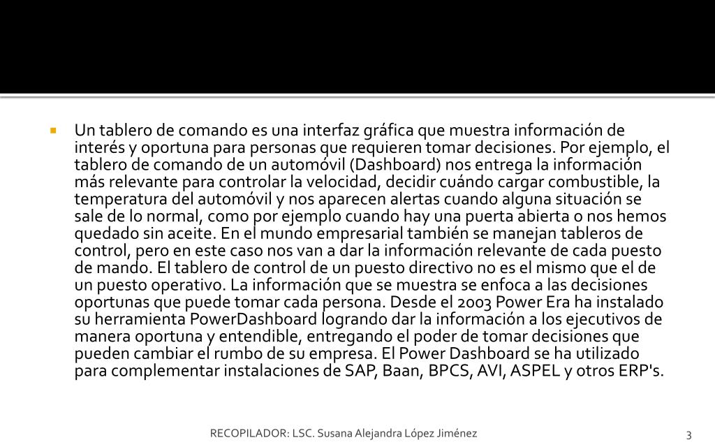Un tablero de comando es una interfaz gráfica que muestra información de interés y oportuna para personas que requieren tomar decisiones. Por ejemplo, el tablero de comando de un automóvil (Dashboard) nos entrega la información más relevante para controlar la velocidad, decidir cuándo cargar combustible, la temperatura del automóvil y nos aparecen alertas cuando alguna situación se sale de lo normal, como por ejemplo cuando hay una puerta abierta o nos hemos quedado sin aceite. En el mundo empresarial también se manejan tableros de control, pero en este caso nos van a dar la información relevante de cada puesto de mando. El tablero de control de un puesto directivo no es el mismo que el de un puesto operativo. La información que se muestra se enfoca a las decisiones oportunas que puede tomar cada persona. Desde el 2003 Power Era ha instalado su herramienta PowerDashboard logrando dar la información a los ejecutivos de manera oportuna y entendible, entregando el poder de tomar decisiones que pueden cambiar el rumbo de su empresa. El Power Dashboard se ha utilizado para complementar instalaciones de SAP, Baan, BPCS, AVI, ASPEL y otros ERP's. RECOPILADOR: LSC. Susana Alejandra López Jiménez
