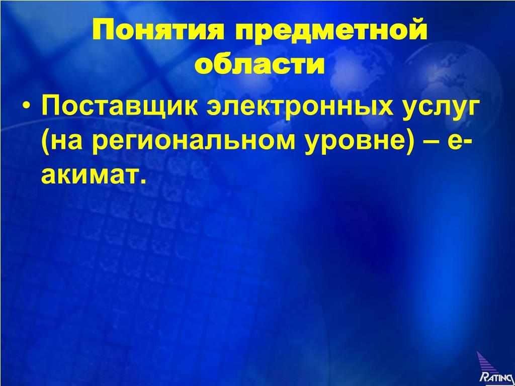 Понятия предметной области • Поставщик электронных услуг (на региональном уровне) – е-акимат.