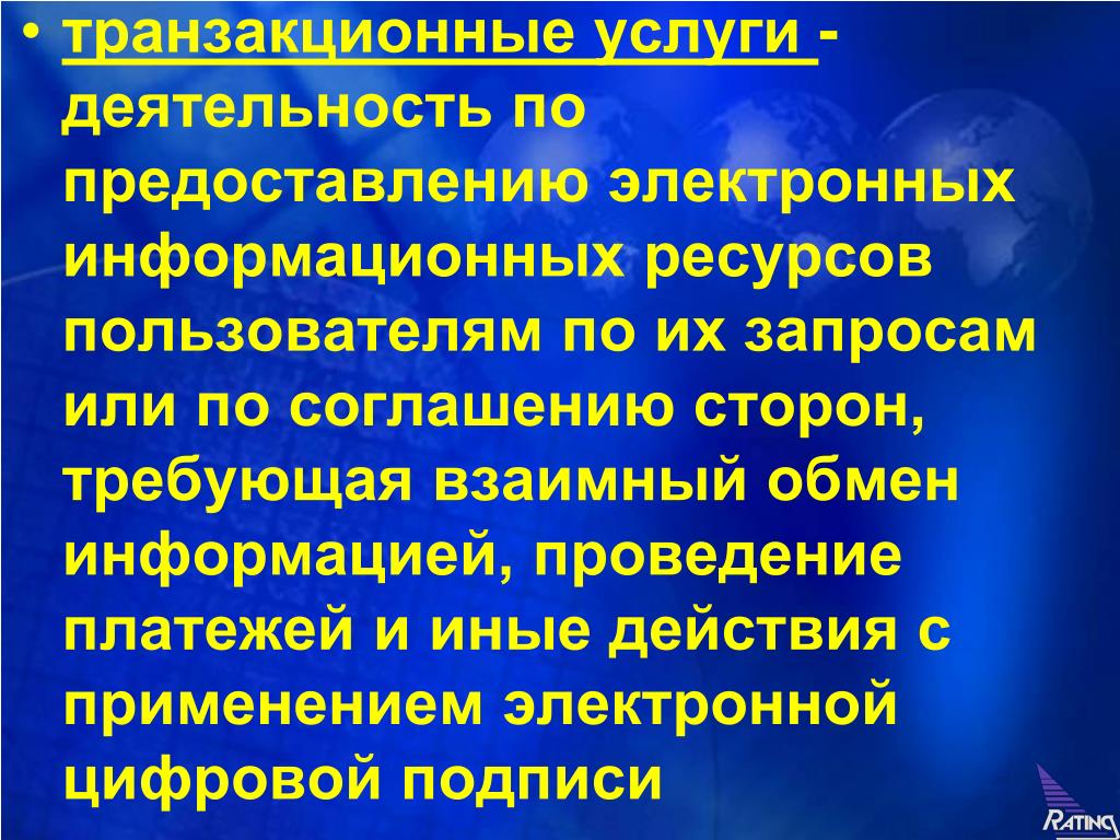 транзакционные услуги - деятельность по предоставлению электронных информационных ресурсов пользователям по их запросам или по соглашению сторон, требующая взаимный обмен информацией, проведение платежей и иные действия с применением электронной цифровой подписи