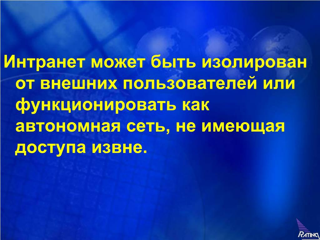 Интранет может быть изолирован от внешних пользователей или функционировать как автономная сеть, не имеющая доступа извне.