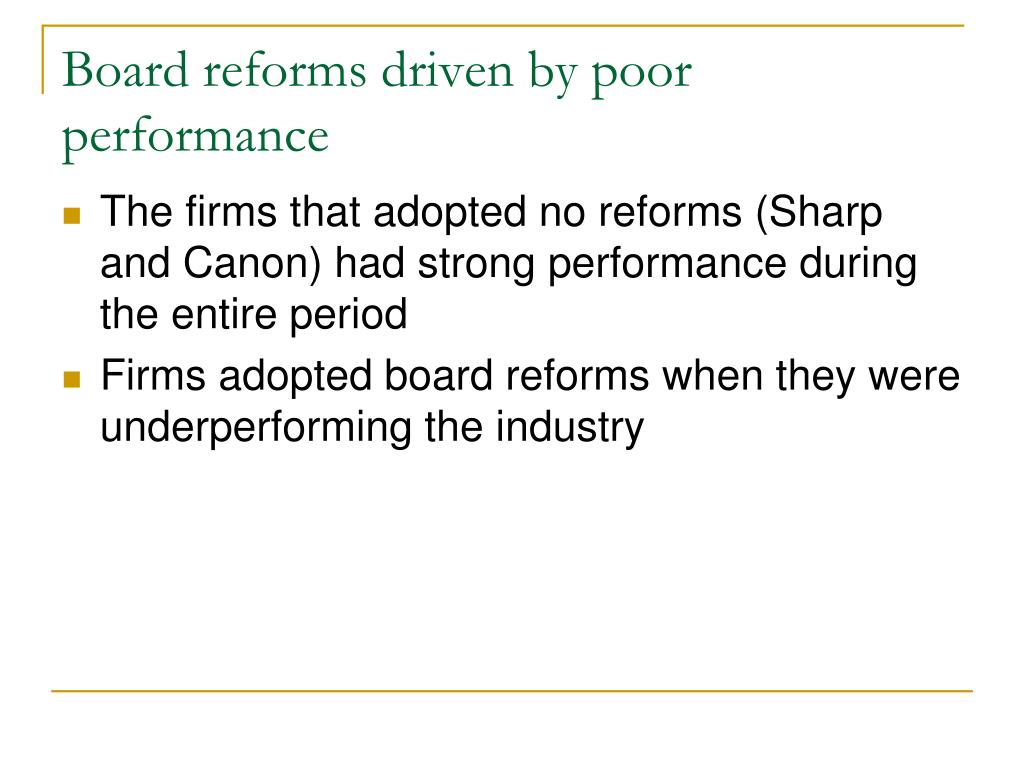 Board reforms driven by poor performance • The firms that adopted no reforms (Sharp and Canon) had strong performance during the entire period • Firms adopted board reforms when they were underperforming the industry