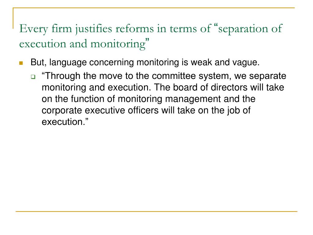 Every firm justifies reforms in terms of “separation of execution and monitoring” • But, language concerning monitoring is weak and vague. • “Through the move to the committee system, we separate monitoring and execution. The board of directors will take on the function of monitoring management and the corporate executive officers will take on the job of execution.”