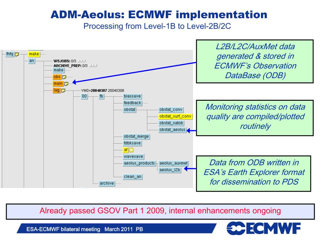 ADM-Aeolus: ECMWF implementationProcessing from Level-1B to Level-2B/2C L2B/L2C/AuxMet data generated & stored in ECMWF’s Observation DataBase (ODB) Monitoring statistics on data quality are compiled/plotted routinely Data from ODB written in ESA’s Earth Explorer format for dissemination to PDS Already passed GSOV Part 1 2009, internal enhancements ongoing