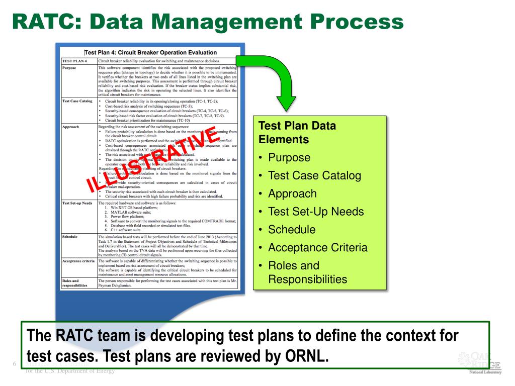 RATC: Data Management Process • Test Plan Data Elements • Purpose • Test Case Catalog • Approach • Test Set-Up Needs • Schedule • Acceptance Criteria • Roles and Responsibilities ILLUSTRATIVE The RATC team is developing test plans to define the context for test cases. Test plans are reviewed by ORNL.