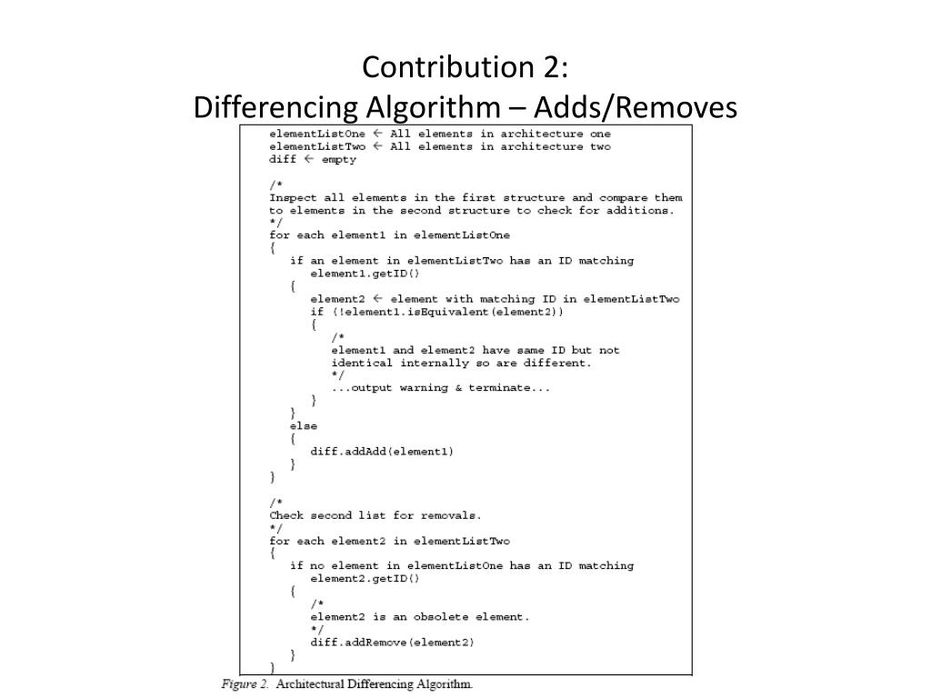 Contribution 2: Differencing Algorithm – Adds/Removes • Input: • Product line architecture 1 • Product line architecture 2 • Output: • XML representing architectural differences • Additions and Removals