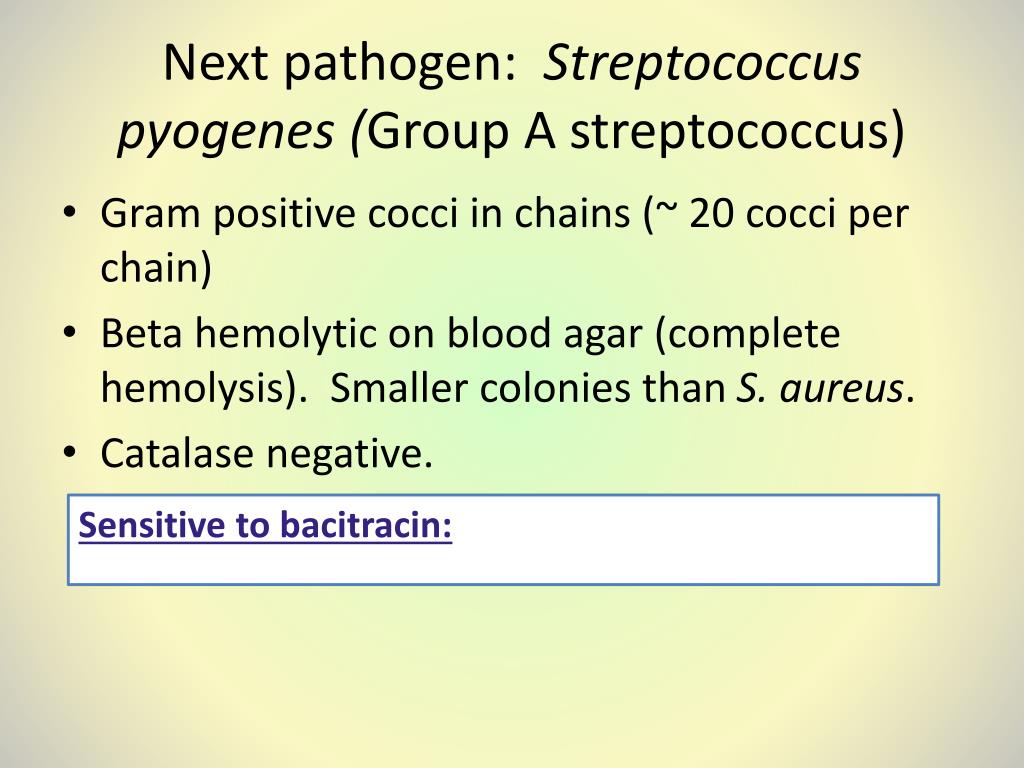 Next pathogen: Streptococcus pyogenes (Group A streptococcus) • Gram positive cocci in chains (~ 20 cocci per chain) • Beta hemolytic on blood agar (complete hemolysis). Smaller colonies than S. aureus. • Catalase negative. Sensitive to bacitracin: